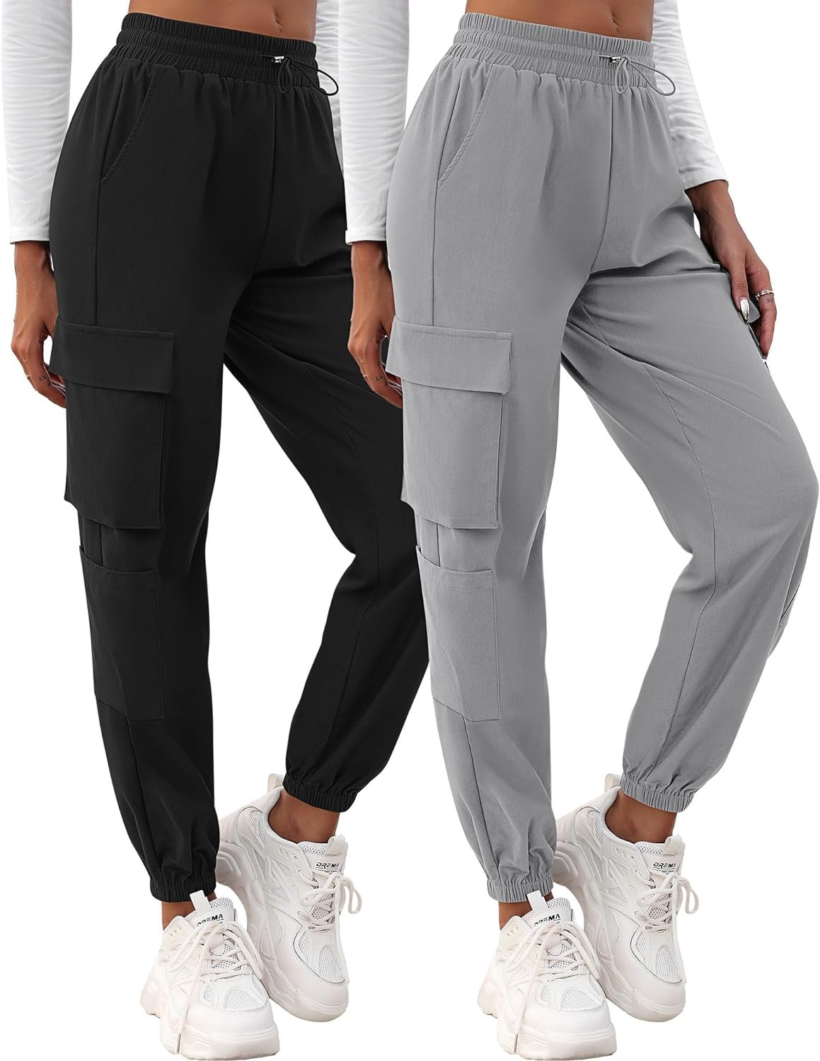 2 Pcs Women’s Cargo Pants High Waisted Hiking Joggers Pants with Pockets Elastic Waist Casual Travel Pants