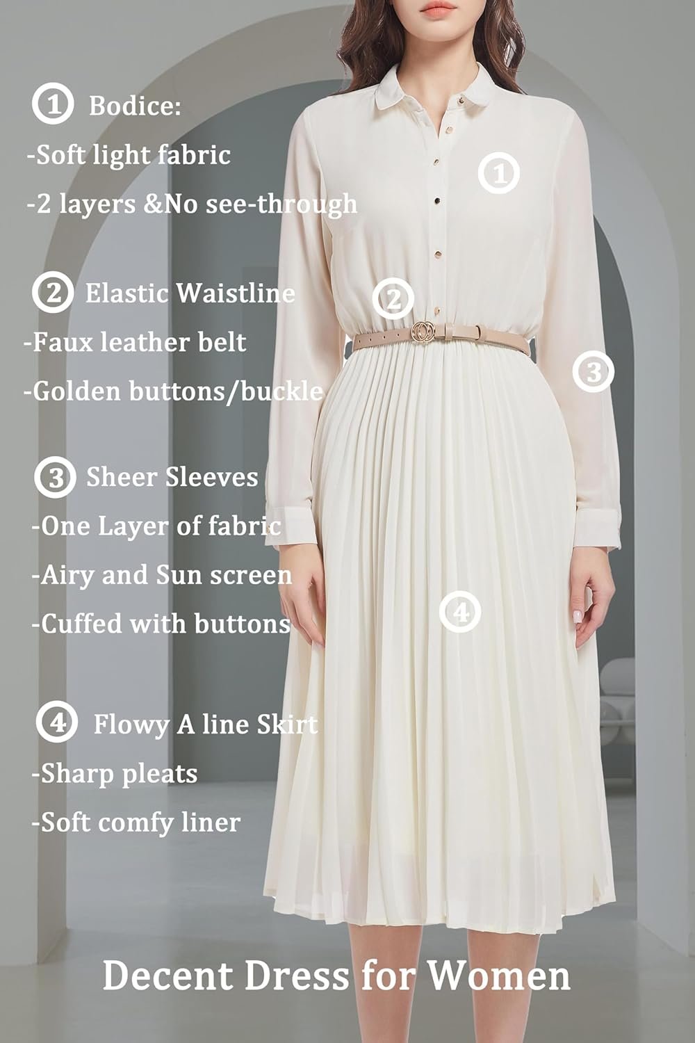 Business Casual Shirt Dress for Women Long Sleeves Pleated Midi Dresses with Belt