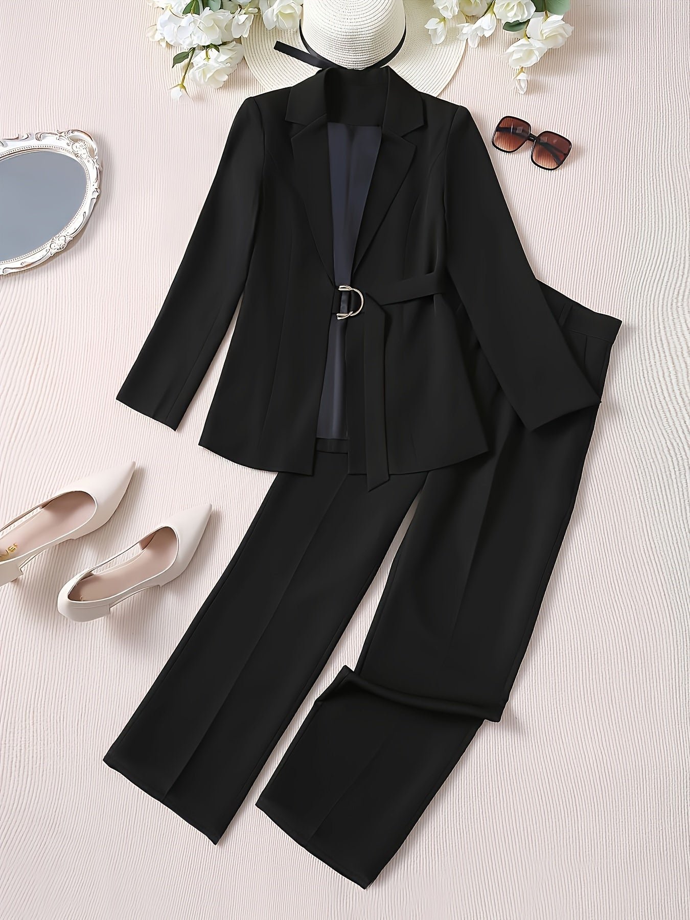 Elegant Office Pants Set, Belted Lapel Long Sleeve Slim Blazer & High Waist Straight Leg Loose Pants, Women’s Clothing