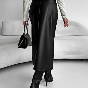 Be the first to review “Plus Size Pu Leather Split Front Skirt, Elegant Slant Pocket Midi Skirt For Spring & Summer, Women’s Plus Size Clothing”