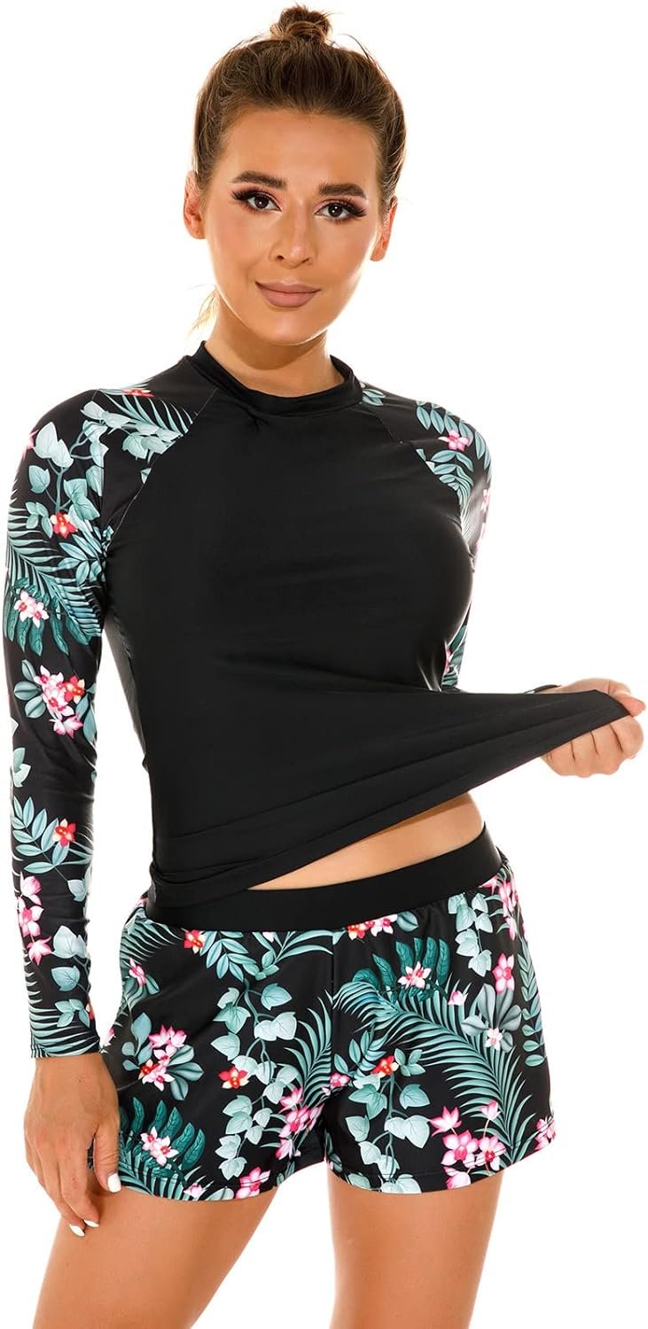 Women 2 Piece Rash Guard Long Sleeve Swimsuits Swim Shirt with Shorts Set Sun Protection UPF 50+ Surf Bathing Suits