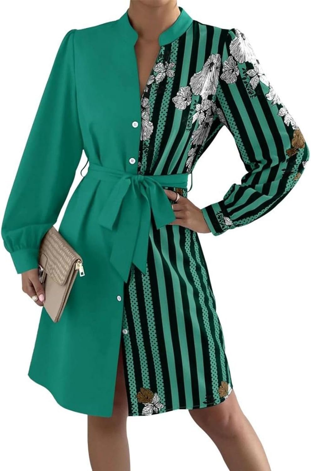 Womens Button Down Shirt Dresses with Belt Button Up Tunics Long Sleeve Blouse Tops