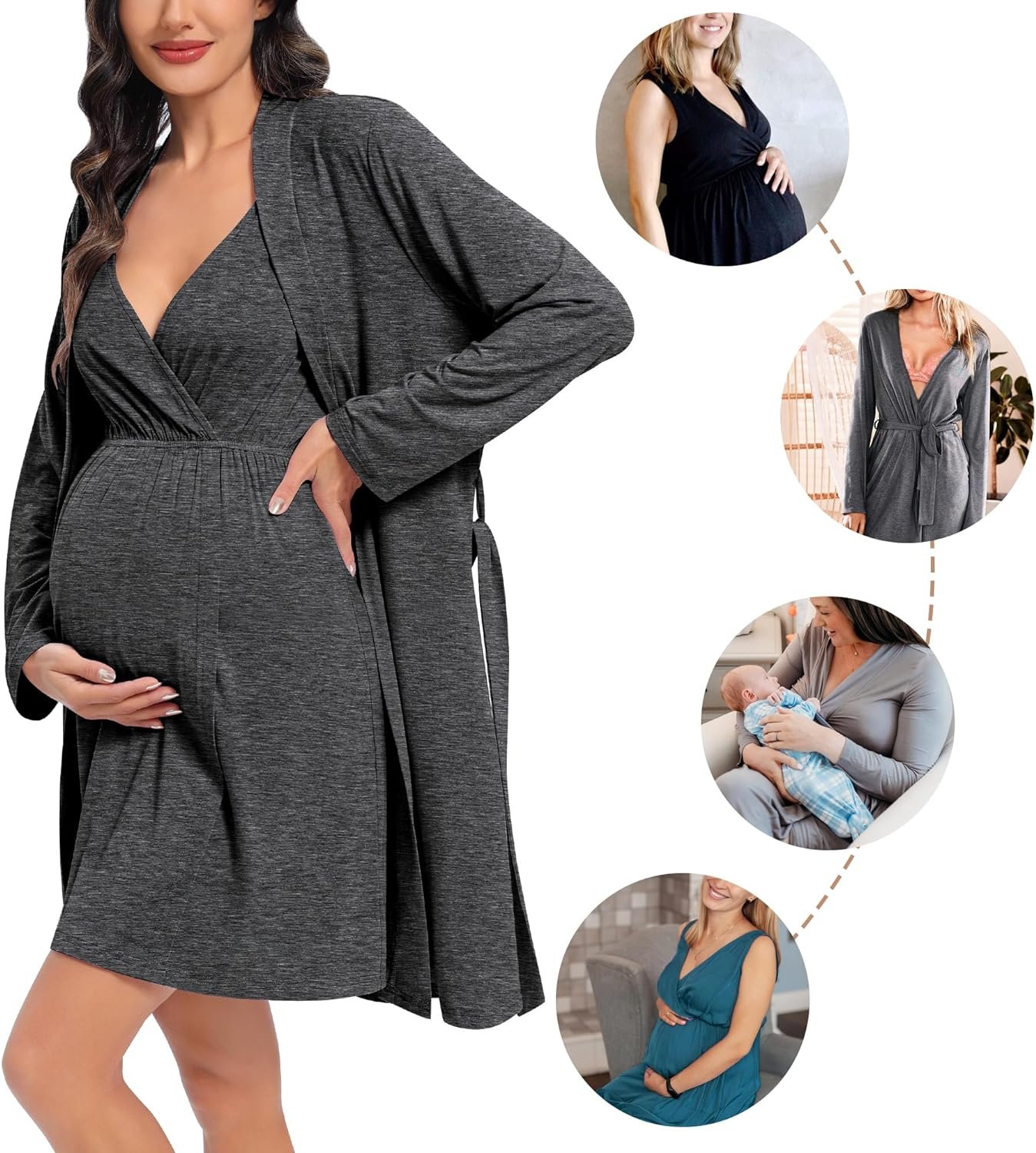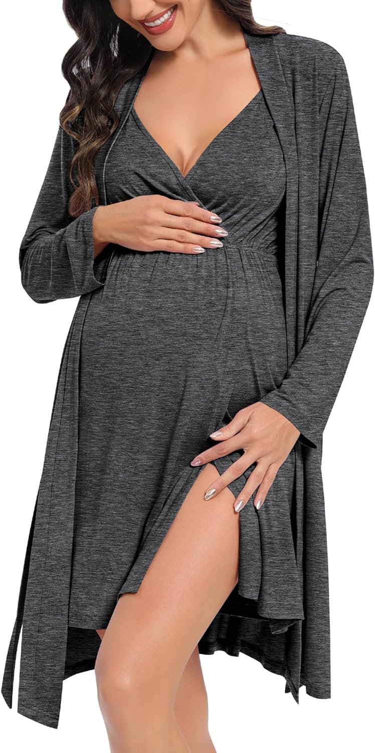 Womens Maternity Set Nursing Nightgown and Robe Set 3 in 1 Labor Delivery Nursing Gown Breastfeeding Robe Set
