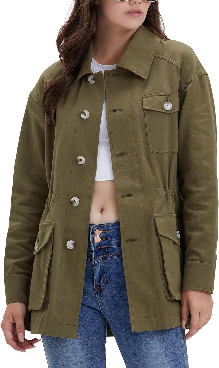 Women’s Military Jacket Lightweight Button Up Utility Drawstring Waist Anorak Coat with Pockets