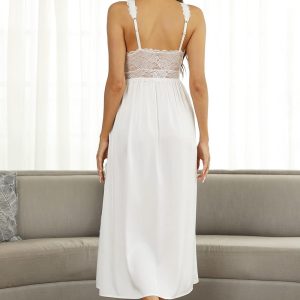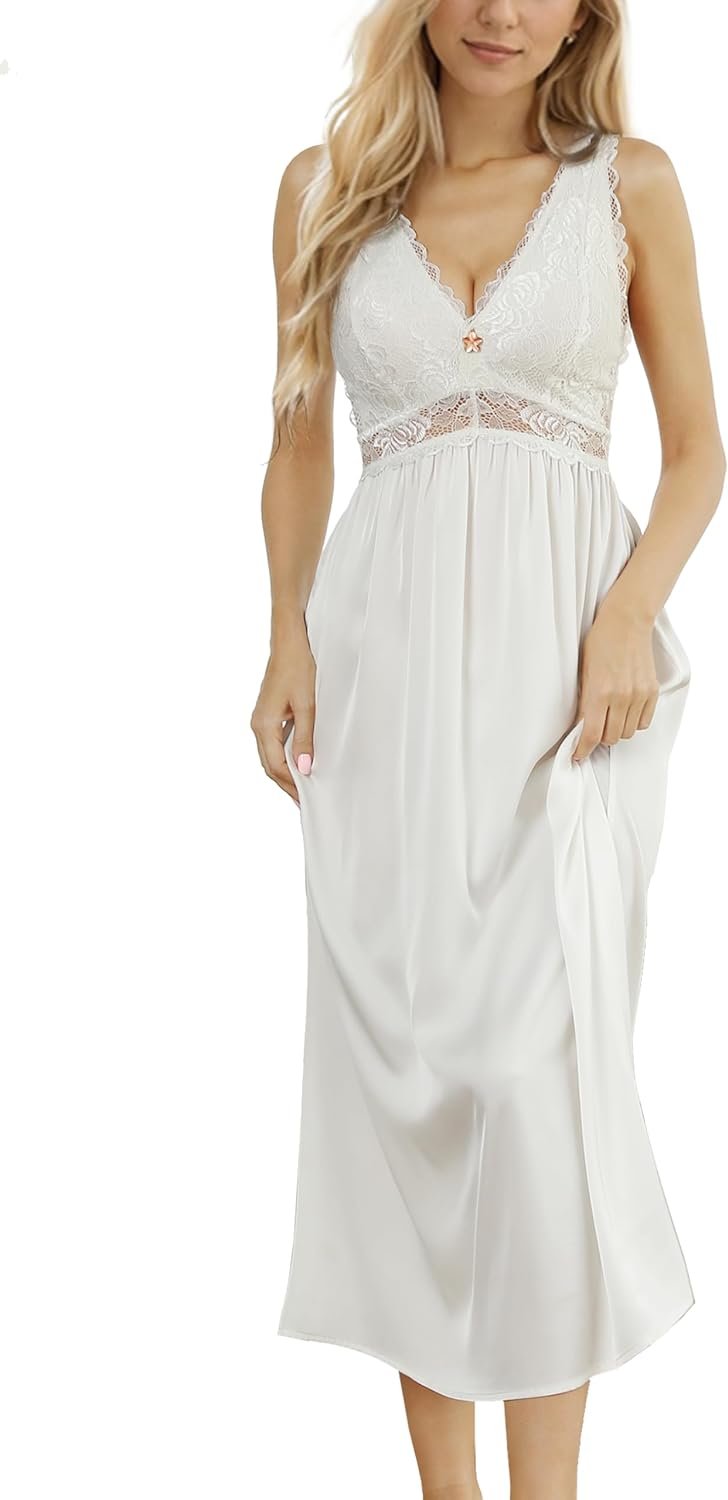 Womens Nightgown Long Sexy Silky V neck Chemise Lace Sleeveless Sleepwear for women Elegant