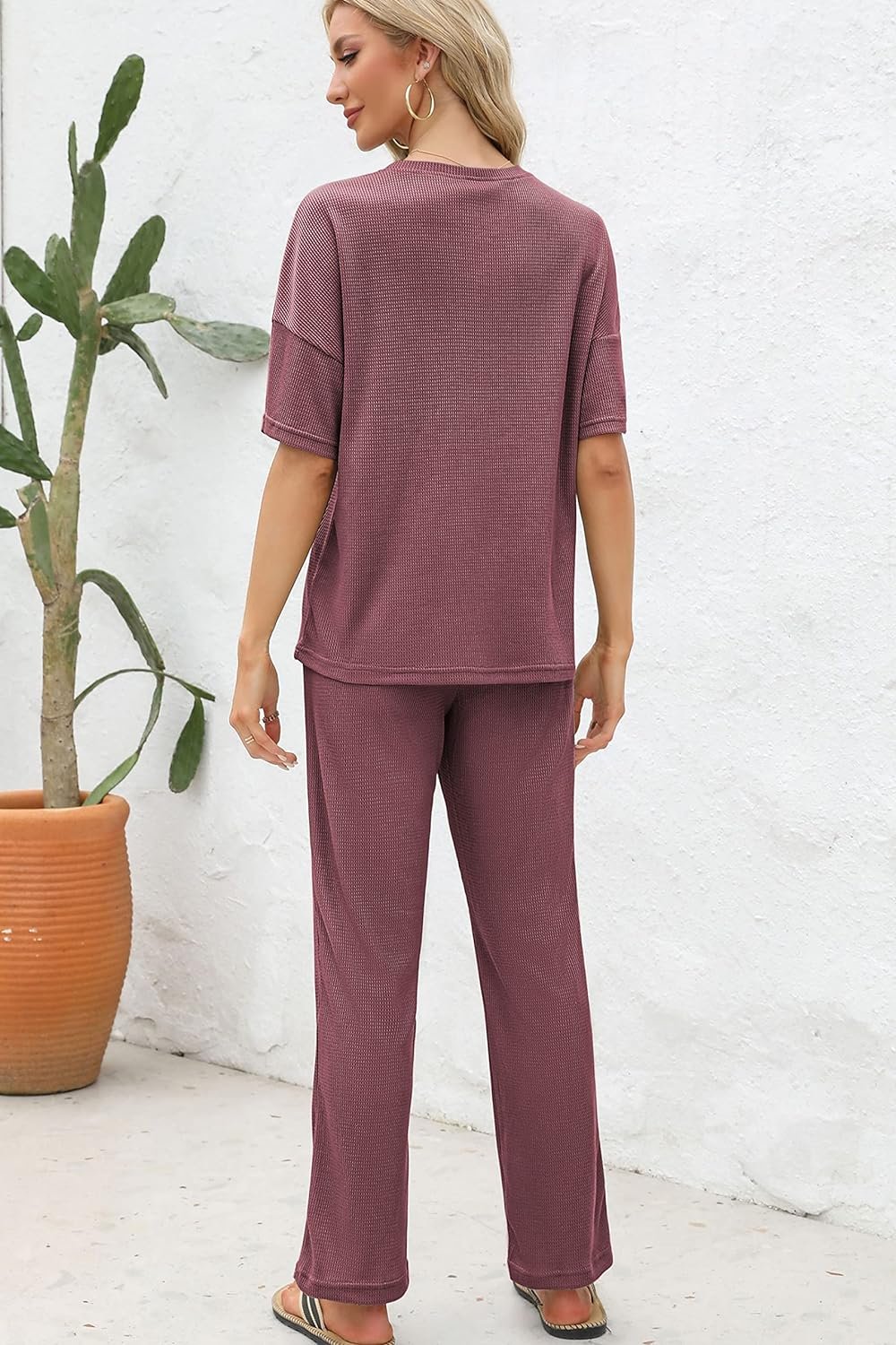 Womens Pajama Sets Waffle Knit Short Sleeve Shirt with Long Pajama Pants Soft Sleepwear Pj Lounge Sets
