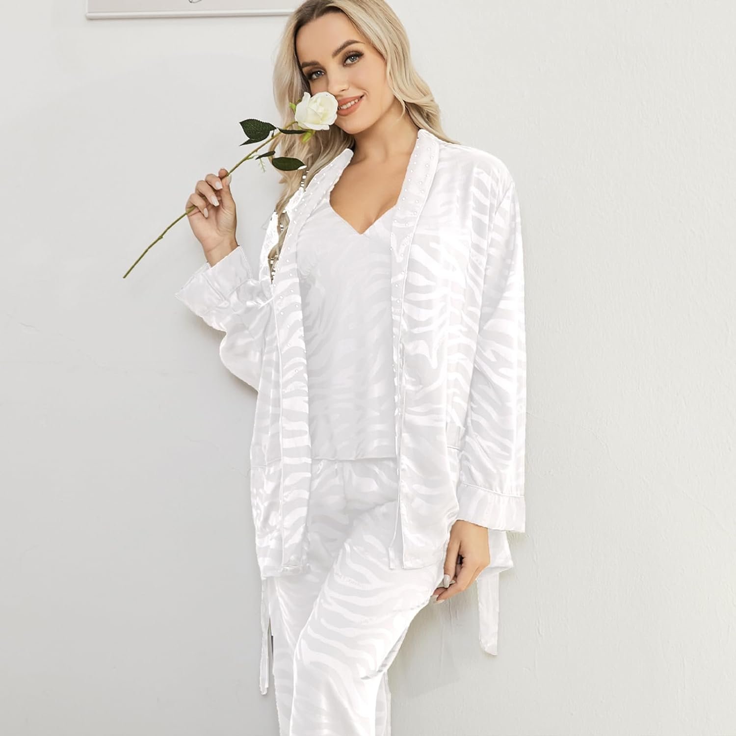 Womens Silk Satin Pajama Sets,Zebra Strips Comfy Robe and Pants Women Pajamas,Silky Camisole Woman Pjs Set 3 Pieces