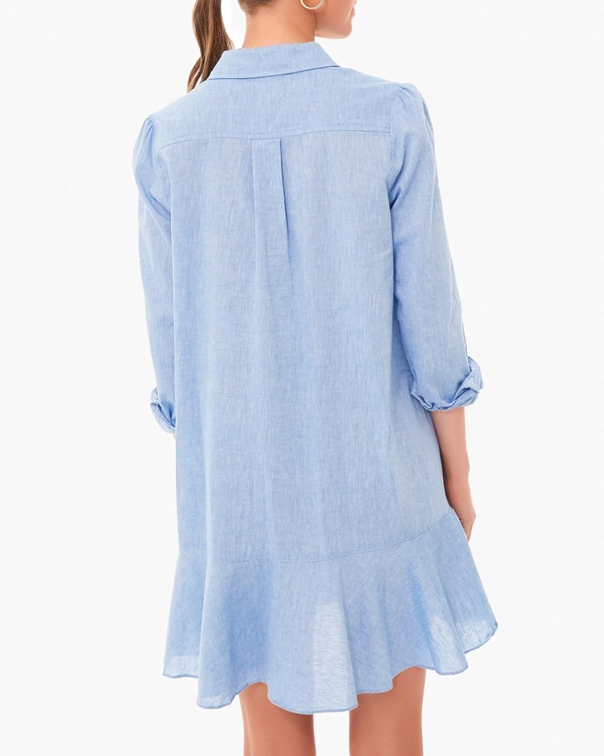 Women’s Tunic Mini Shirt Dress Cotton Long Sleeve Ruffle Hem Dress Button Up Shift Chambray Dresses