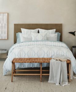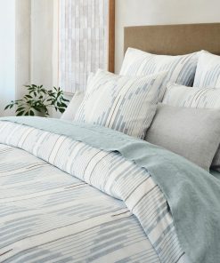 Our Morelia shams are inspired by a vintage African ikat textile, yarn-dyed organic cotton woven on dobby looms, use a double-beam technique to create a pattern of lines, diamonds and zigzags. Details woven in a heavier weight yarn punctuate the blues and grays with pops of brighter color. The self-backed shams are finished with a clean, simple edge and an envelope closure.