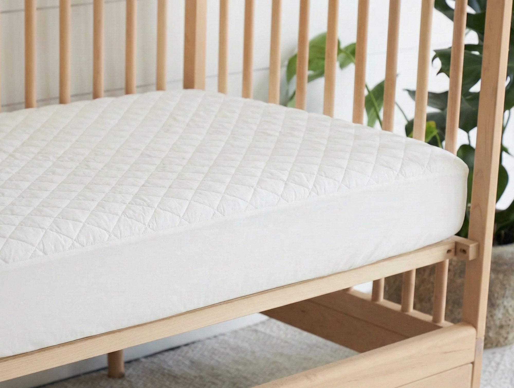 100% organic cotton, inside and out, our crib mattress pad sets the perfect foundation on top of the mattress and under a crib fitted sheet. Finished with two-inch quilted squares and a 220 percale covering. Free of chemical finishes and flame retardants, GOTS certified.
